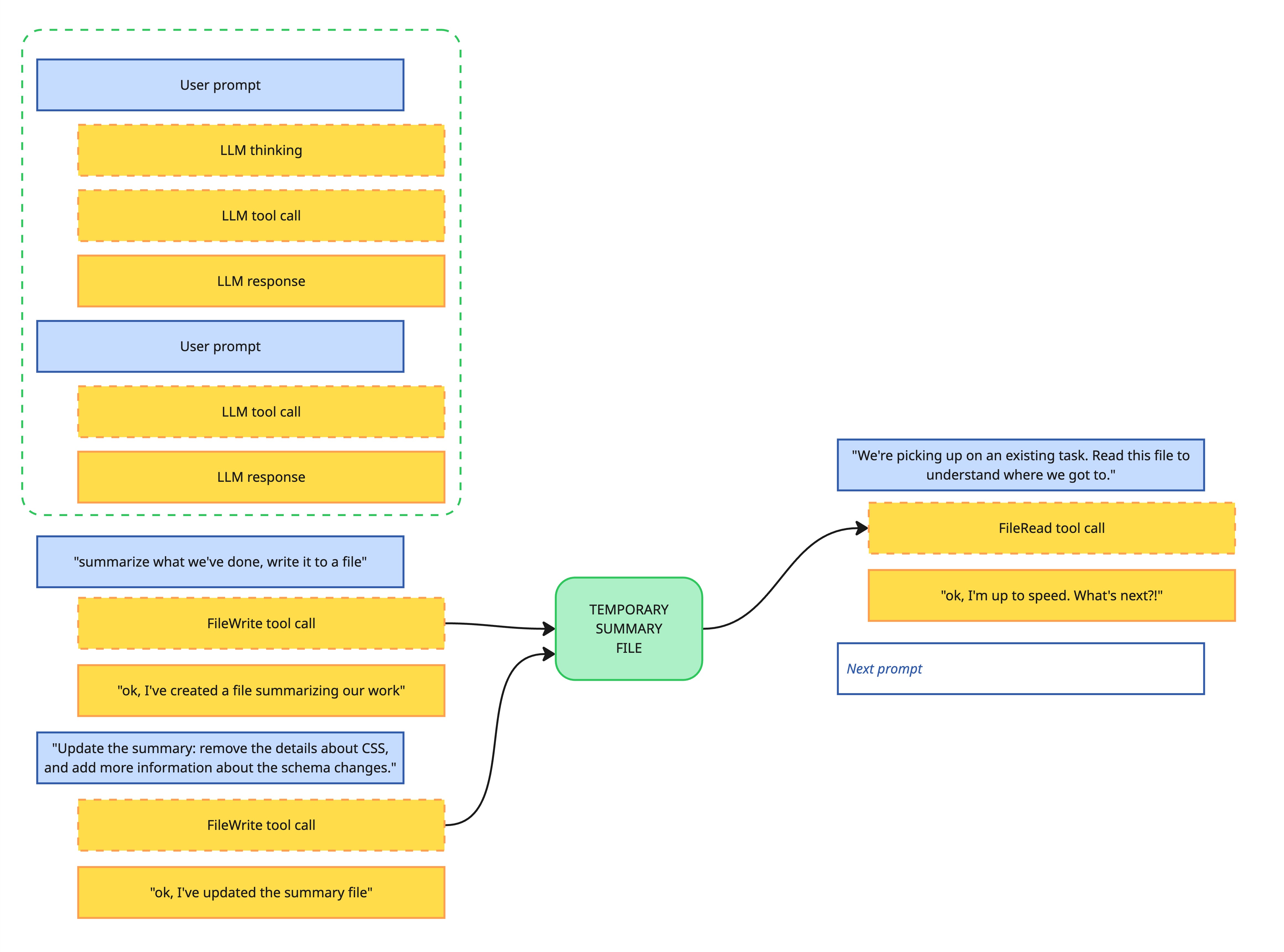 I will typically ask the LLM to write this summary to a temporary file, and then I’ll either manually edit it, or ask the LLM to make changes. Then I’ll start an entirely fresh conversation, with a prompt like: