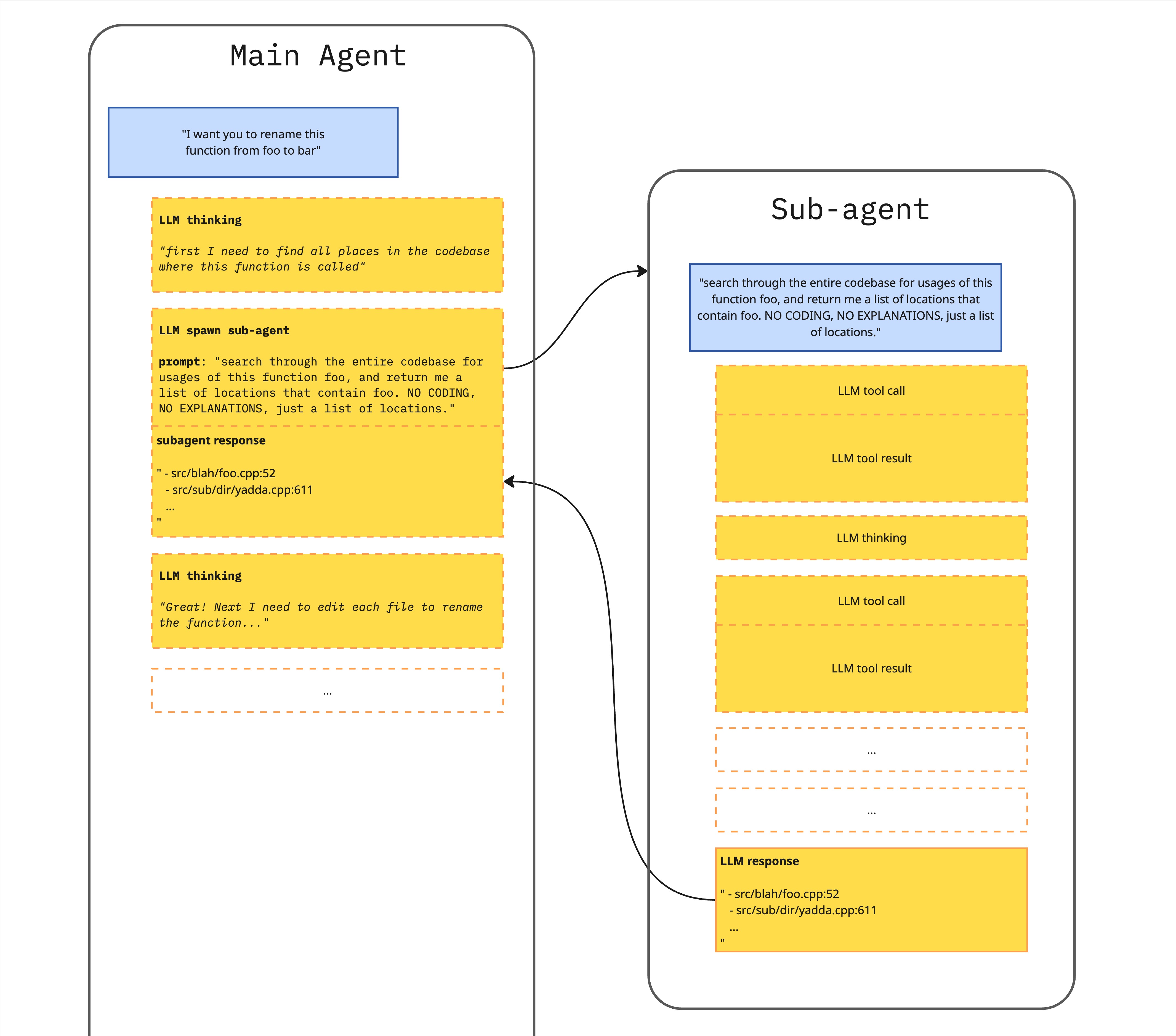 Sub-contexts are another way to deal keep low-level details out of the conversation history, by preventing detailed task information from getting into the agent’s context in the first place. Coding agents achieve that by creating short-lived contexts that are only used for the lifetime of a specific task.